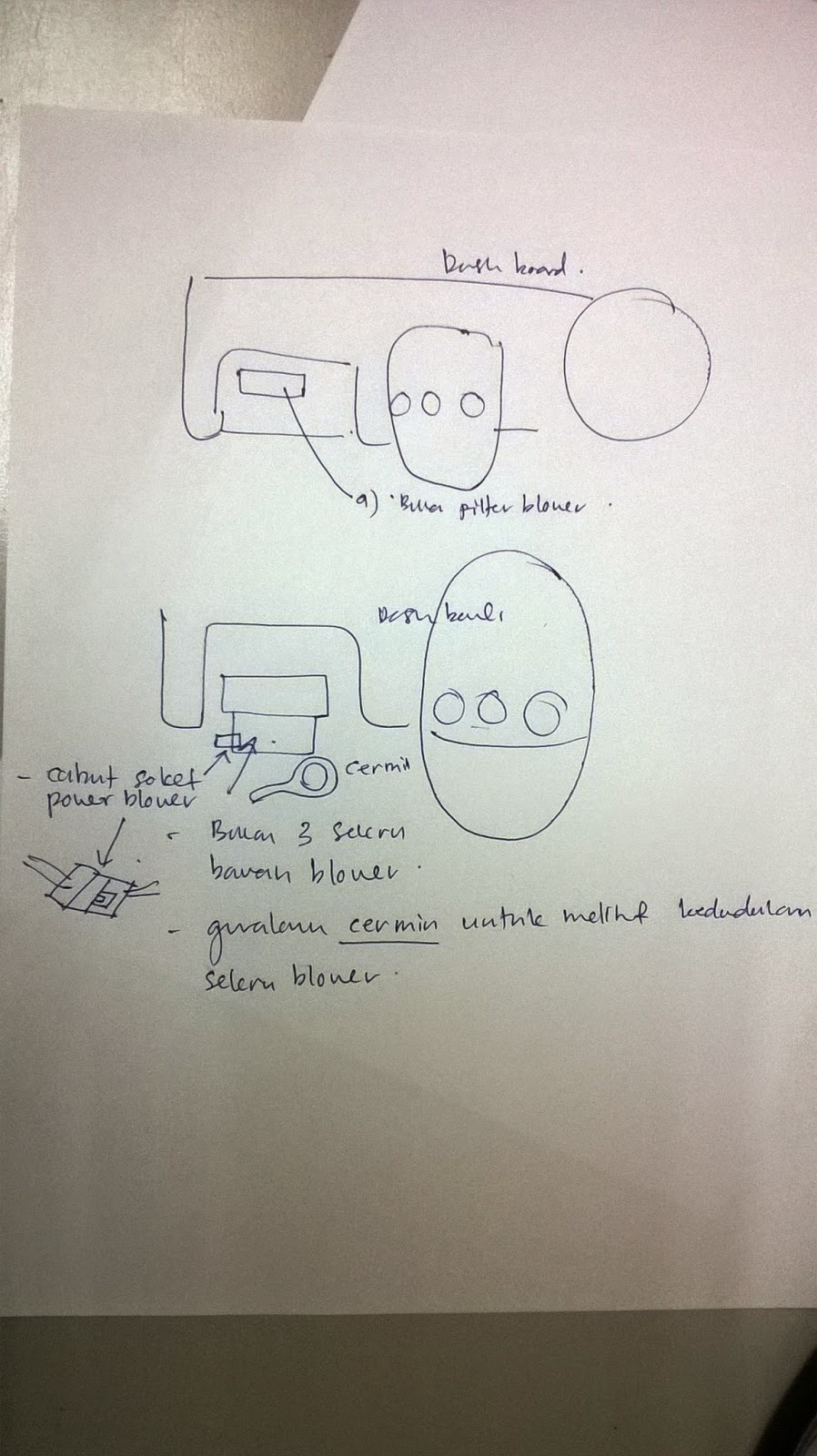 – Terdapat 3 sekru dibawah blower. kedudukanya tesorok. anda perlua mengunakan sekru driver kecil. untuk mudah melihat anda boleh gunakan cermin untuk mengintai kedudukkan sekru. dan membukanya.