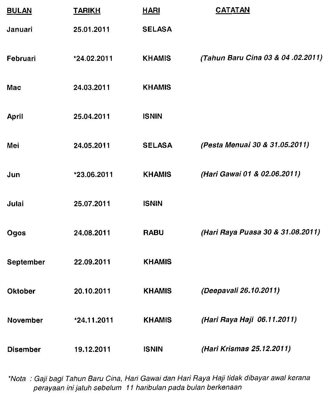 Berikut merupakan jadual gaji bagi seluruh kakitangan awam di Malaysia bagi tahun 2011
