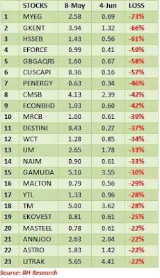 Kaunter2 saham sebelum dan selepas Pakatan Harapan menjadi kerajaan sehingga hari ini. Pendapat Admin, elakan trade atau simpan saham2 berikut dimana harga saham dijangka akan terus menurun di masa akan datang. Tidak dikecuali juga pemegang saham terbesar akan cuba menswastakan syarikat mereka dgn menawarkan harga lebih tinggi (sekurang2 lebih tinggi drp harga semasa)utk beli semua saham baki yg ada di pasaran, keadaan ini berlaku sebab harga saham telah didagang dibawah nilai, sebagai contoh seperti ASTRO. Jadi Anda boleh kutip sedikit2 secara berperingkat pada setiap kali harga saham menurun sementara itu Anda masih boleh dapat dividen drp pelaburan Anda.