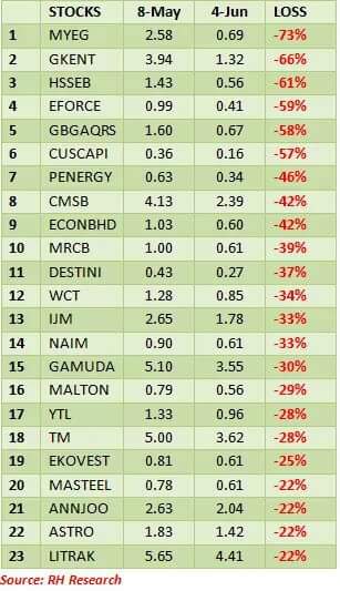 Kaunter2 saham sebelum dan selepas Pakatan Harapan menjadi kerajaan sehingga hari ini. Pendapat Admin, elakan trade atau simpan saham2 berikut dimana harga saham dijangka akan terus menurun di masa akan datang. Tidak dikecuali juga pemegang saham terbesar akan cuba menswastakan syarikat mereka dgn menawarkan harga lebih tinggi (sekurang2 lebih tinggi drp harga semasa)utk beli semua saham baki yg ada di pasaran, keadaan ini berlaku sebab harga saham telah didagang dibawah nilai, sebagai contoh seperti ASTRO. Jadi Anda boleh kutip sedikit2 secara berperingkat pada setiap kali harga saham menurun sementara itu Anda masih boleh dapat dividen drp pelaburan Anda.