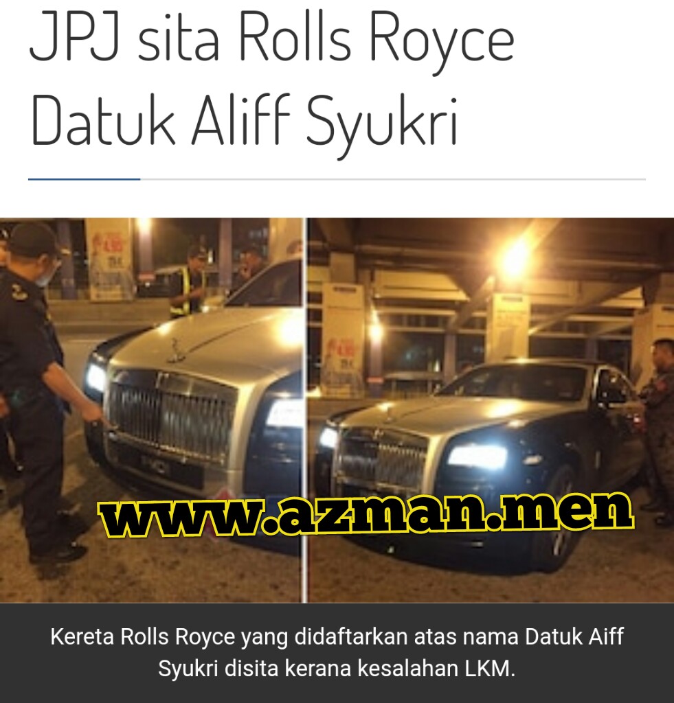 Rolls Royce dipercayai milik Pengarah Urusan D’herbs Holding Sdn Bhd, Datuk Aliff Syukri, antara 20 kenderaan disita dalam Op Patuh Jabatan Pengangkutan Jalan (JPJ) di Jalan Bangsar, malam tadi.