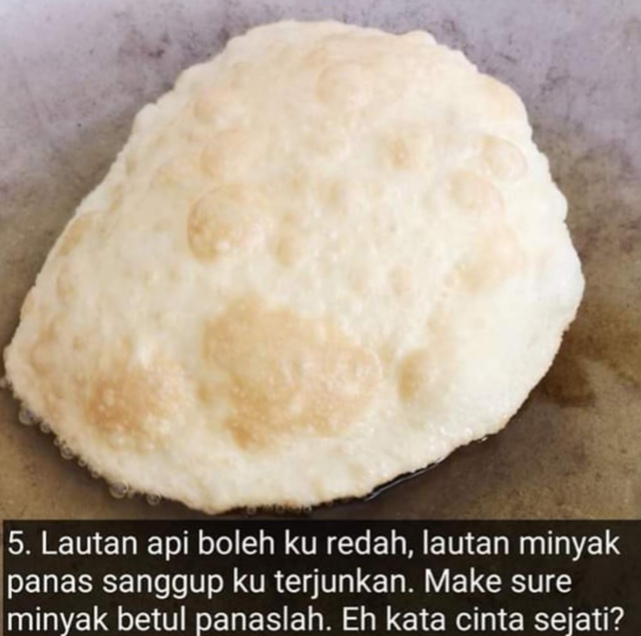 3. Sambil goreng, curah minyak panas tu bnyk kali atas roti Puri sampai dia kembong sendiri.