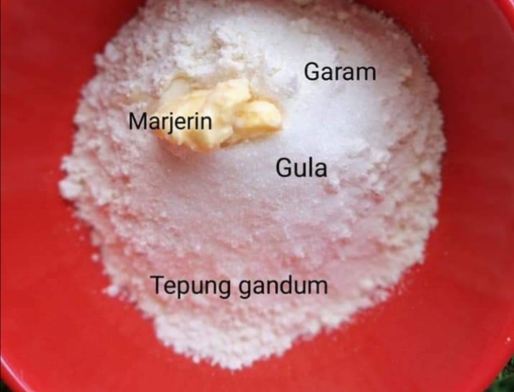 1. Masukkan tepung, garam, marjerin dan gula. Gaul rata.