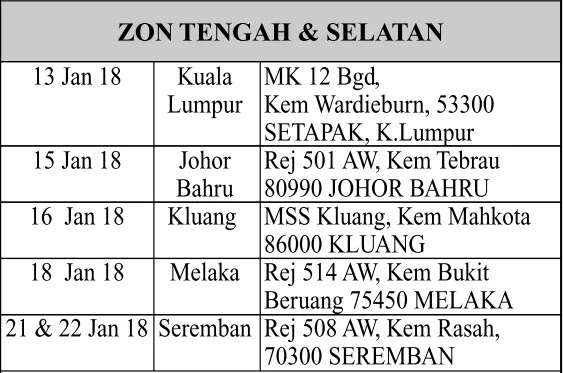 Belia Malaysia yang berkelayakan dan berminat untuk menyertai Tentera Darat Malaysia anda diperlawa untuk hadir beramai-ramai bagi sesi pemilihan awal di Pusat-pusat pemilihan yang telah ditetapkan seperti berikut:-
