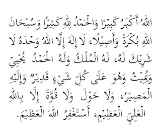 Allah Maha Besar, segala puji bagi Allah. Maha Suci Allah pagi dan petang. Tiada Tuhan yang disembah melainkan Allah Yang Maha Esa, tidak ada bersekutu denganNya sesuatu. Baginya kerajaan, baginya segala pujian. Dialah yang menghidupkan dan mematikan. Dialah Yang Maha Kuasa ke atas segala sesuatu dan kepada Allah jualah tempat kembali. Tidak ada daya dan tidak ada kekuatan, kecuali dengan pertolongan Allah Yang Maha Tinggi dan Maha Agung. Aku mohon keampunan daripada Allah.