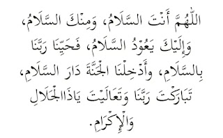 Ya Allah, Engkau yang menyelamatkan, daripadaMu keselamatan, kepadaMu kembali keselamatan. Maka hidupkanlah kami wahai Tuhan, dalam keselamatan. Masukkan kami ke syurga, negara keselamatan. Maka sucilah Engkau wahai Tuhan kami, Tuhan yang mempunyai kebesaran dan kemuliaan.