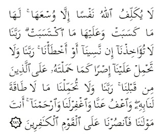 Allah tidak memberati seseorang melainkan apa yang terdaya olehnya. Ia mendapat pahala kebaikan yang diusahakannya, dan ia juga menanggung dosa kejahatan yang diusahakannya. (Mereka berdoa dengan berkata): “Wahai Tuhan kami! Janganlah Engkau mengirakan kami salah jika kami lupa atau kami tersalah. Wahai Tuhan kami ! Janganlah Engkau bebankan kepada kami bebanan yang berat sebagaimana yang telah Engkau bebankan kepada orang-orang yang terdahulu daripada kami. Wahai Tuhan kami! Janganlah Engkau pikulkan kepada kami apa yang kami tidak terdaya memikulnya. Dan maafkanlah kesalahan kami, serta ampunkanlah dosa kami, dan berilah rahmat kepada kami. Engkaulah Penolong kami; oleh itu, tolonglah kami untuk mencapai kemenangan terhadap kaum-kaum yang kafir”