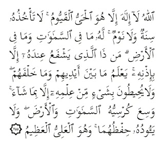 Allah, tiada Tuhan (yang berhak disembah) melainkan Dia, Yang Tetap hidup, Yang Kekal selama-lamanya mentadbirkan (sekalian makhlukNya). Yang tidak mengantuk usahkan tidur. Yang memiliki segala yang ada di langit dan yang ada di bumi. Tiada sesiapa yang dapat memberi syafaat (pertolongan) di sisiNya melainkan dengan izinNya. yang mengetahui apa yang ada di hadapan mereka dan apa yang ada di belakang mereka, sedang mereka tidak mengetahui sesuatu pun dari (kandungan) ilmu Allah melainkan apa yang Allah kehendaki (memberitahu kepadanya). Luasnya Kursi Allah (ilmuNya dan kekuasaanNya) meliputi langit dan bumi; dan tiadalah menjadi keberatan kepada Allah menjaga serta memelihara keduanya. Dan Dia lah Yang Maha Tinggi (darjat kemuliaanNya), lagi Maha Besar (kekuasaanNya)