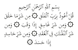 Katakanlah (wahai Muhammad); “Aku berlindung kepada (Allah) Tuhan yang menciptakan sekalian makhluk. Dari bencana makhluk-makhluk yang Ia ciptakan. Dan dari bahaya gelap apabila ia masuk. Dan dari kejahatan makhluk-makhluk yang menghembus-hembus pada simpulan-simpulan (dan ikatan-ikatan). Dan dari kejahatan orang yang dengki apabila ia melakukan dengkinya.