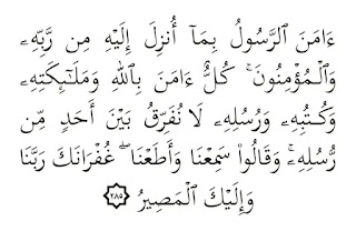 Rasulullah telah beriman kepada apa yang diturunkan kepadanya dari Tuhannya, dan juga orang-orang yang beriman; semuanya beriman kepada Allah, dan Malaikat-malaikatNya, dan Kitab-kitabNya, dan Rasul-rasulNya. (Mereka berkata): “Kami tidak membezakan antara seorang dengan yang lain Rasul-rasulnya”. Mereka berkata lagi: Kami dengar dan kami taat (kami pohonkan) keampunanMu wahai Tuhan kami, dan kepadaMu jualah tempat kembali”.
