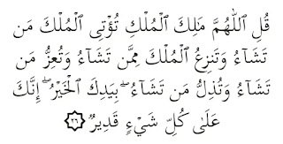 Katakanlah (wahai Muhammad): “Wahai Tuhan yang mempunyai kuasa pemerintahan! Engkaulah yang memberi kuasa pemerintahan kepada sesiapa yang Engkau kehendaki, dan Engkaulah yang mencabut kuasa pemerintahan dari sesiapa yang Engkau kehendaki. Engkaulah juga yang memuliakan sesiapa yang Engkau kehendaki, dan Engkaulah yang menghina sesiapa yang Engkau kehendaki. Dalam kekuasaan Engkaulah sahaja adanya segala kebaikan. Sesungguhnya Engkau Maha Kuasa atas tiap-tiap sesuatu.