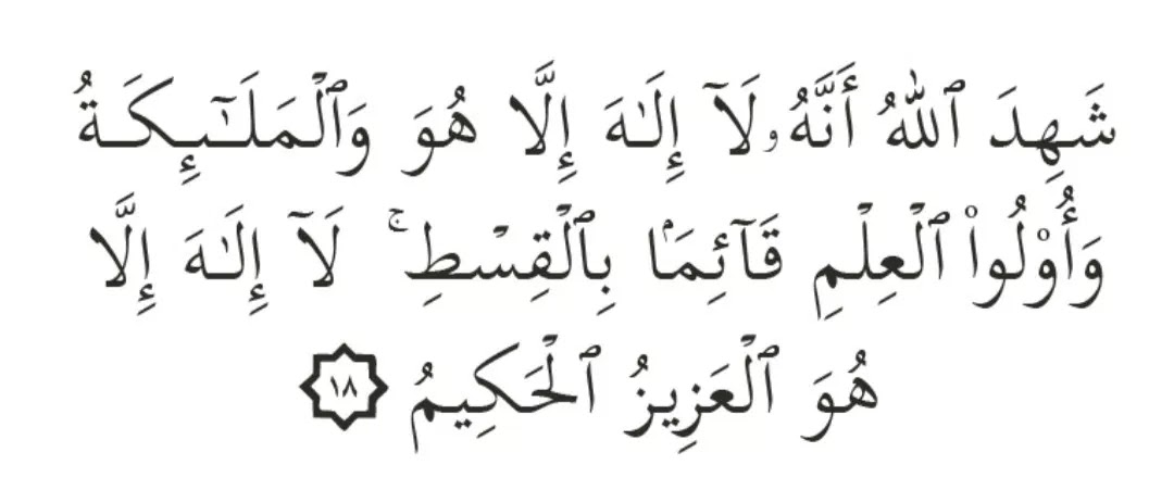 Allah menerangkan (kepada sekalian makhlukNya dengan dalil-dalil dan bukti), bahawasanya tiada Tuhan (yang berhak disembah) melainkan Dia, Yang sentiasa mentadbirkan (seluruh alam) dengan keadilan, dan malaikat-malaikat serta orang-orang yang berilmu (mengakui dan menegaskan juga yang demikian); tiada Tuhan (yang berhak disembah) melainkan Dia; Yang Maha Kuasa, lagi Maha Bijaksana.