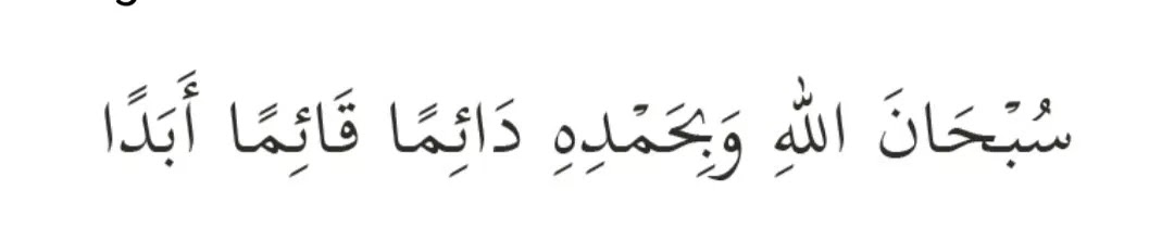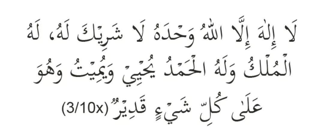 Allah Maha Besar, segala puji bagi Allah. Maha Suci Allah pagi dan petang. Tiada Tuhan yang disembah melainkan Allah Yang Maha Esa, tidak ada bersekutu denganNya sesuatu. Baginya kerajaan, baginya segala pujian. Dialah yang menghidupkan dan mematikan. Dialah Yang Maha Kuasa ke atas segala sesuatu dan kepada Allah jualah tempat kembali. Tidak ada daya dan tidak ada kekuatan, kecuali dengan pertolongan Allah Yang Maha Tinggi dan Maha Agung. Aku mohon keampunan daripada Allah.