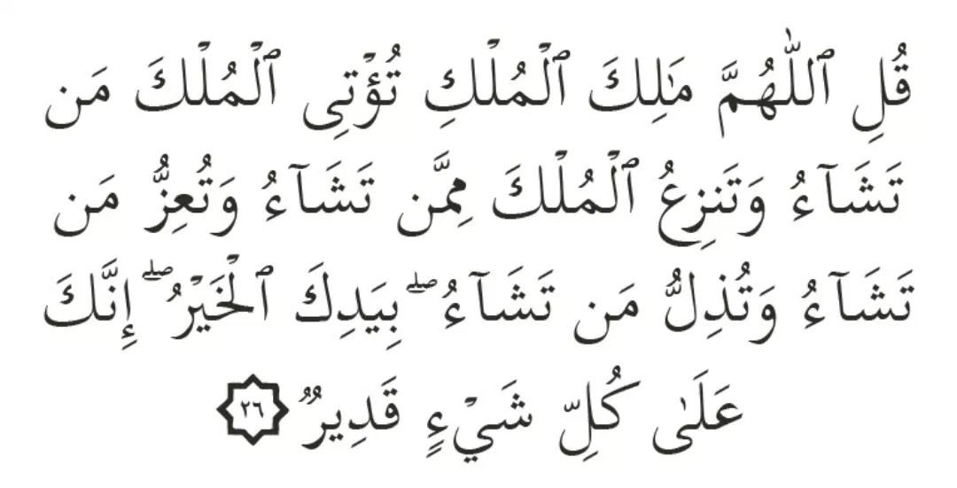 Katakanlah (wahai Muhammad): “Wahai Tuhan yang mempunyai kuasa pemerintahan! Engkaulah yang memberi kuasa pemerintahan kepada sesiapa yang Engkau kehendaki, dan Engkaulah yang mencabut kuasa pemerintahan dari sesiapa yang Engkau kehendaki. Engkaulah juga yang memuliakan sesiapa yang Engkau kehendaki, dan Engkaulah yang menghina sesiapa yang Engkau kehendaki. Dalam kekuasaan Engkaulah sahaja adanya segala kebaikan. Sesungguhnya Engkau Maha Kuasa atas tiap-tiap sesuatu.