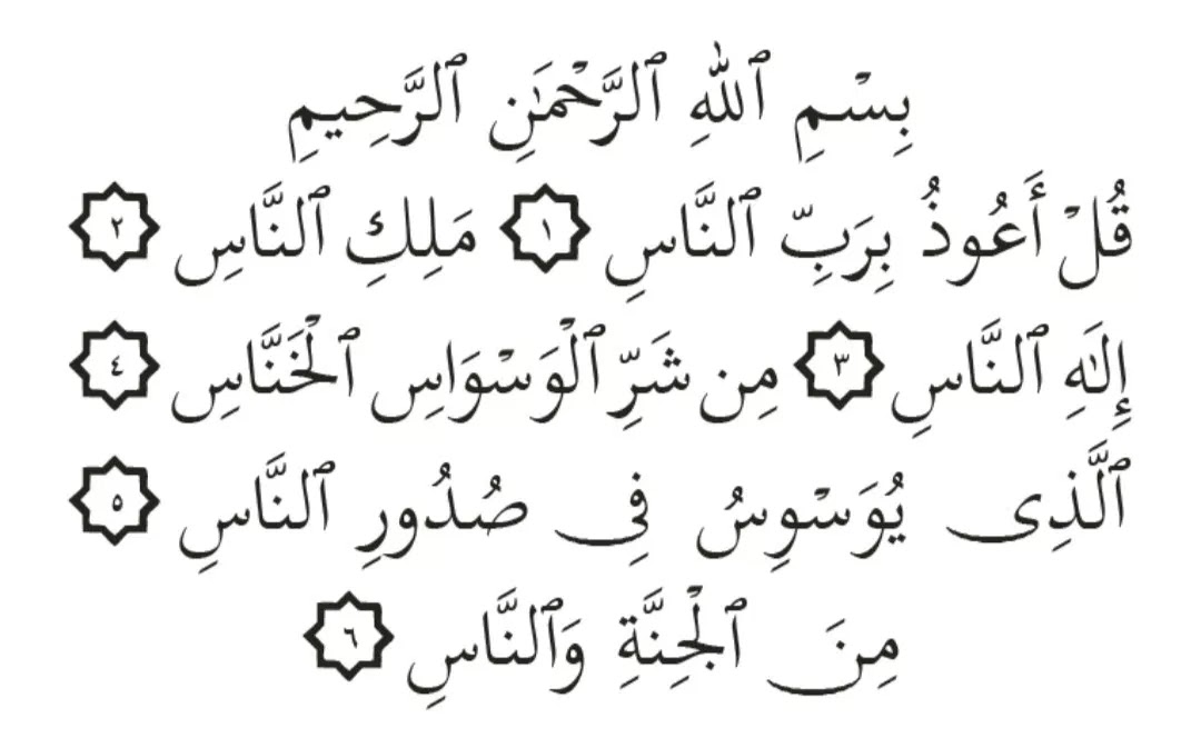 Katakanlah (wahai Muhammad): “Aku berlindung kepada (Allah) Pemulihara sekalian manusia. Yang Menguasai sekalian manusia. Tuhan yang berhak disembah oleh sekalian manusia. Dari kejahatan pembisik penghasut yang timbul tenggelam. Yang melemparkan bisikan dan hasutannya ke dalam hati manusia. (Iaitu pembisik dan penghasut) dari kalangan jin dan manusia”